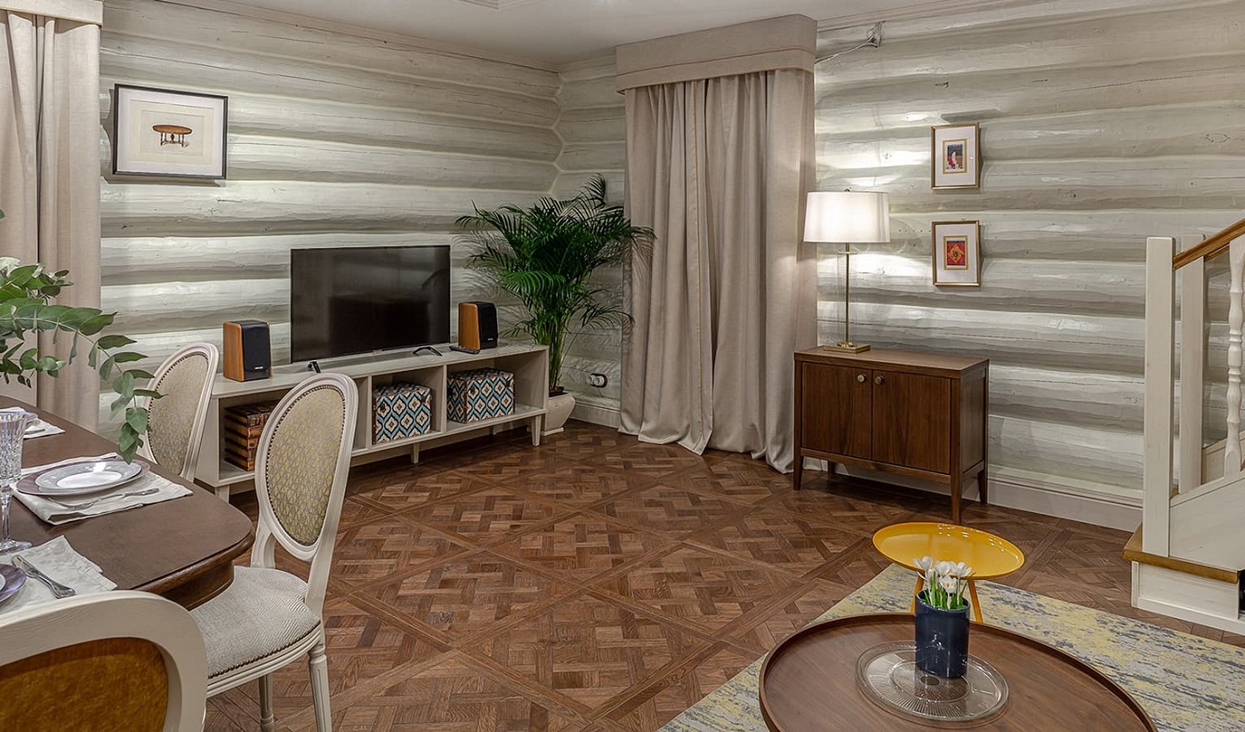 Это именно то пространство, о котором только мечтали герои: светлая, солнечная гостиная с прекрасным паркетом на полу! Брашированная обработка древесины подчеркивает натуральность деревянного пола. Модульный паркет Lab Arte и доска имеют фаску по периметру – за счет этого выделяются рисунок и габариты элемента. Защитно-декоративное покрытие – лак – не только придает паркету эстетику, но и выполняет защитную функцию. Тонировка цвета «Табак» создает однородный тон с видимыми порами, что подчеркивает текстуру древесины.