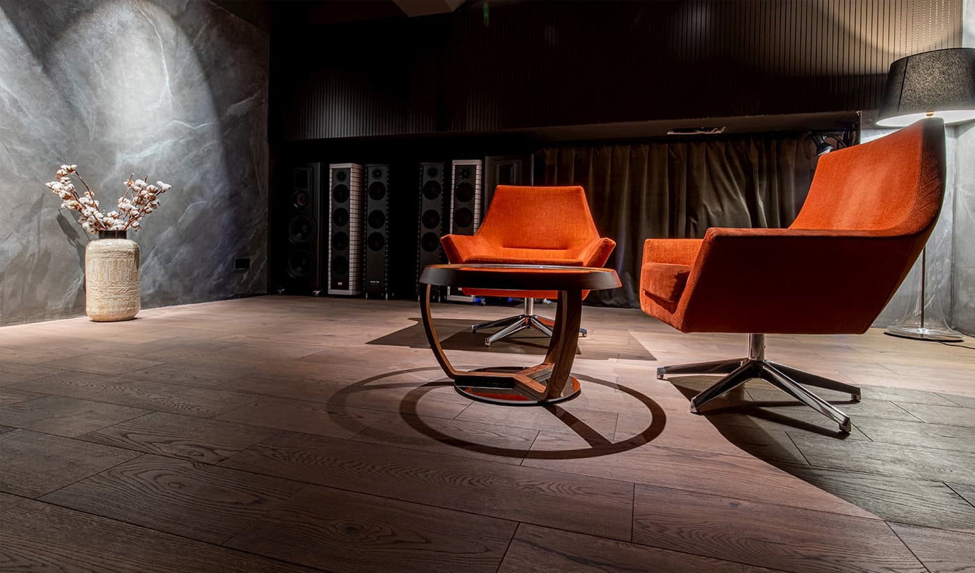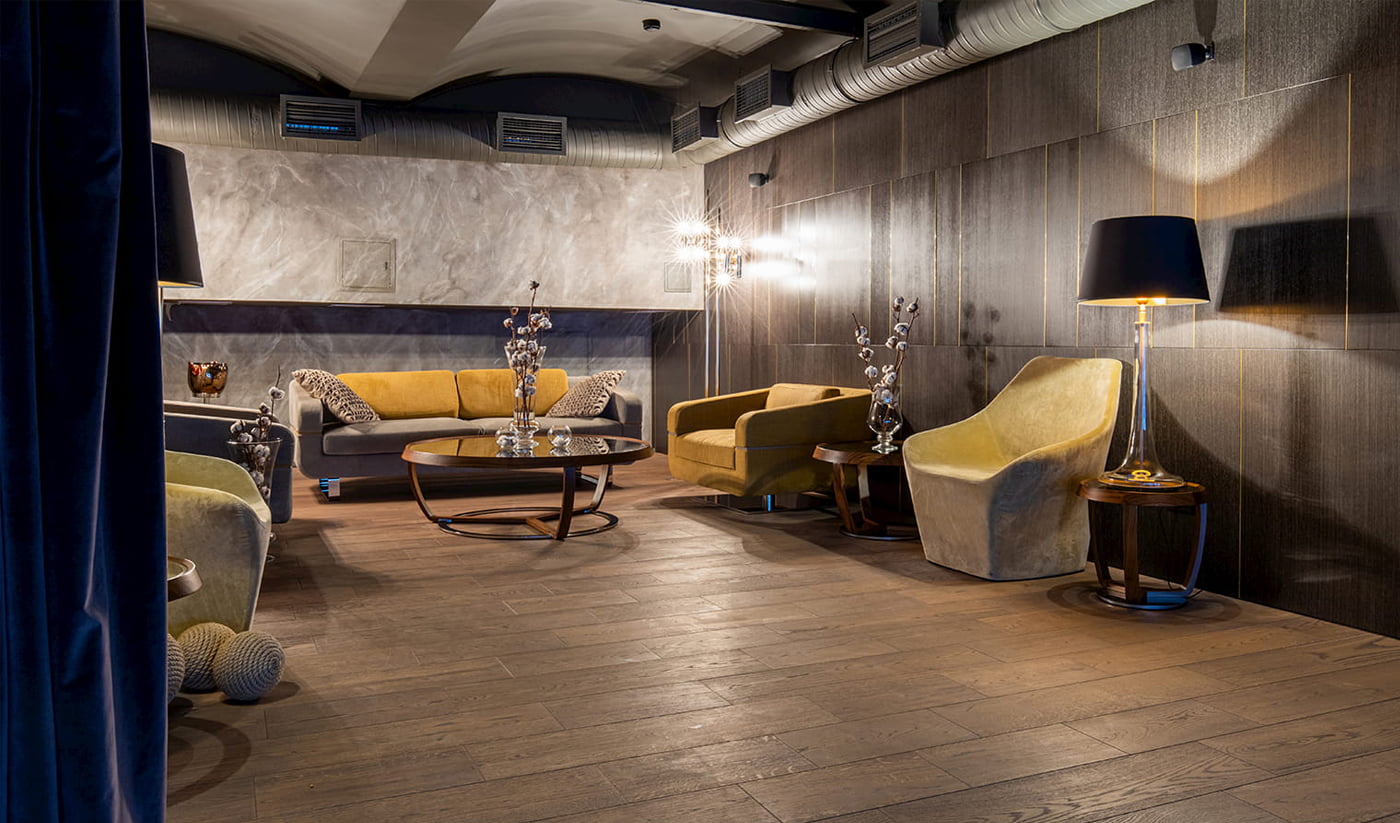 Кто сказал, что натуральные полы нельзя использовать в общественных помещениях? В новом пространстве кинотеатра-ресторана FOSTER CINEMA на втором этаже в лаунж-зоне и зоне прослушивания аудиосистем уложена натуральная доска под маслом. В состав масла входят натуральные материалы и обладает бактерицидными свойствами, такие полы можно укладывать в помещениях, где живут люди, страдающие астмой.