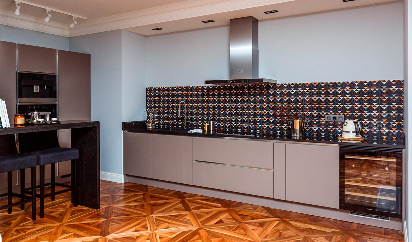 Екатерина Бекух : «Графичный рисунок паркета смотрится очень эффектно, К тому же такой пол будет красиво стариться». В проекте использован LabArte модульный паркет Орех американский.