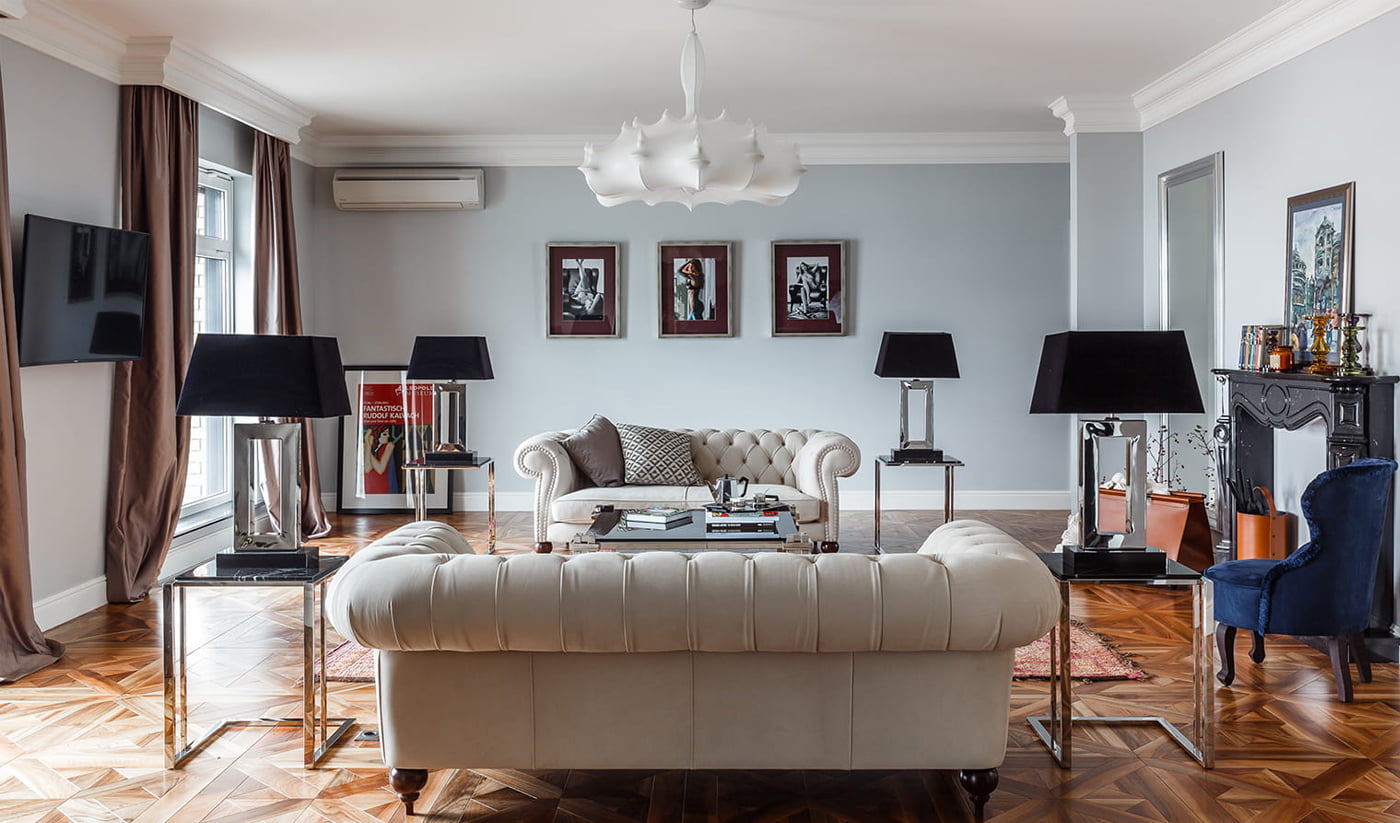 Просторную квартиру с видом на Цемесскую бухту Екатерина Бекух оформила для молодой женщины с дочкой-подростком. Элементы классики - модульный паркет, высокие гипсовые карнизы, мраморный портал камина и современное наполнение и декор – создали актуальный интерьер, который мог бы находиться в любой из европейских столиц. Модульный паркет из американского ореха с геометричным рисунком , который уложили во всех комнатах, стал связующим звеном между всеми зонами квартиры.