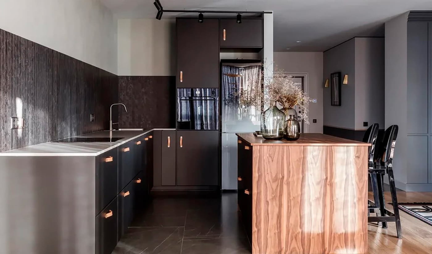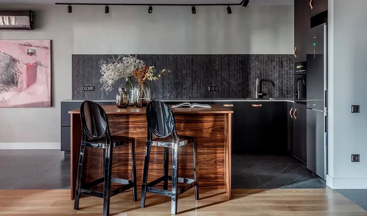 Дизайнер Екатерина Бекух спроектировала жилье для себя и двух своих детей, сына 15 лет и дочери 9 лет. Одно из главных достоинств квартиры – балконы, обращенные на запад, и возможность любоваться закатами по вечерам. Благодаря тому, что отсутствовала несущая стена, Екатерина смогла соединить гостиную и кухню, получилось большое пространство, в котором семья проводит основное время. Оформляя интерьер, дизайнер действовала интуитивно — так что многое, по ее словам, сложилось в нем само собой. Хотела создать не пафосный интерьер, который бы выглядел как современная европейская квартира. И как – то само собой получилось, что в этом проекте абсолютно отсутствует белый цвет, а темные графитовые оттенки противопоставлены светло-серым. Так сложилась комбинация темного керамогранита на полу и светлой инженерной доски, мебели для кухни цвета графит – и светло – серой столешницы. Общие помещения получились достаточно ахроматичными по выбору отделочных материалов. А вот в спальнях уже использованы насыщенные оттенки. Визуально увеличить высоту потолков и дверных проемов помог прием покраски стены и потолков в один цвет.