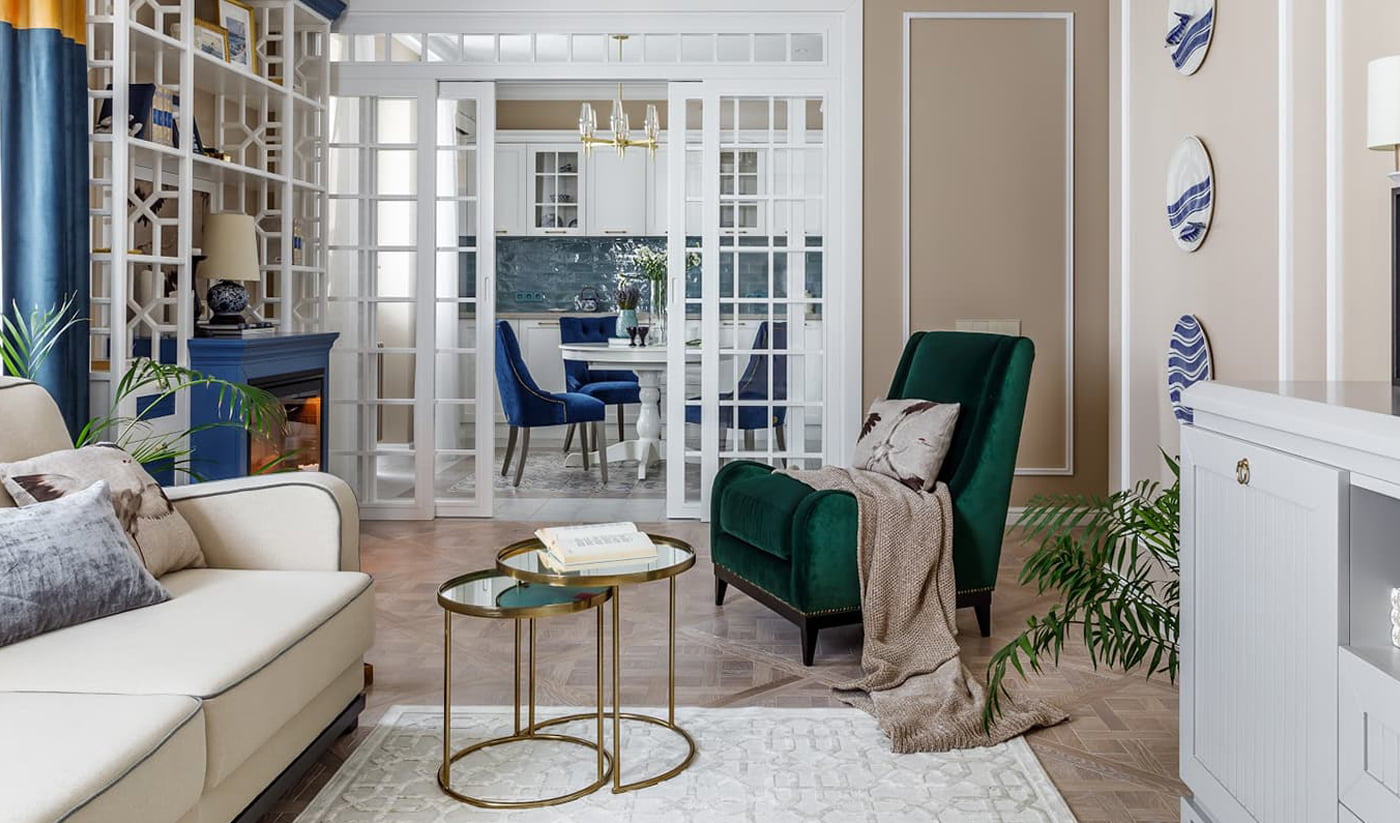 Это проект, выполненный для мамы заказчика, которая несколько лет жила в Японии, и очень любит гжель. Мы отталкивались от этих двух факторов плюс от желания создать яркий, теплый, радостный интерьер. Именно поэтому родилась такая идея: традиционная городская классика с элементами восточной стилистики. Проект полностью был реализован в условиях удаленной работы с заказчиками. Получилось идеально, поскольку было понимание и доверие.