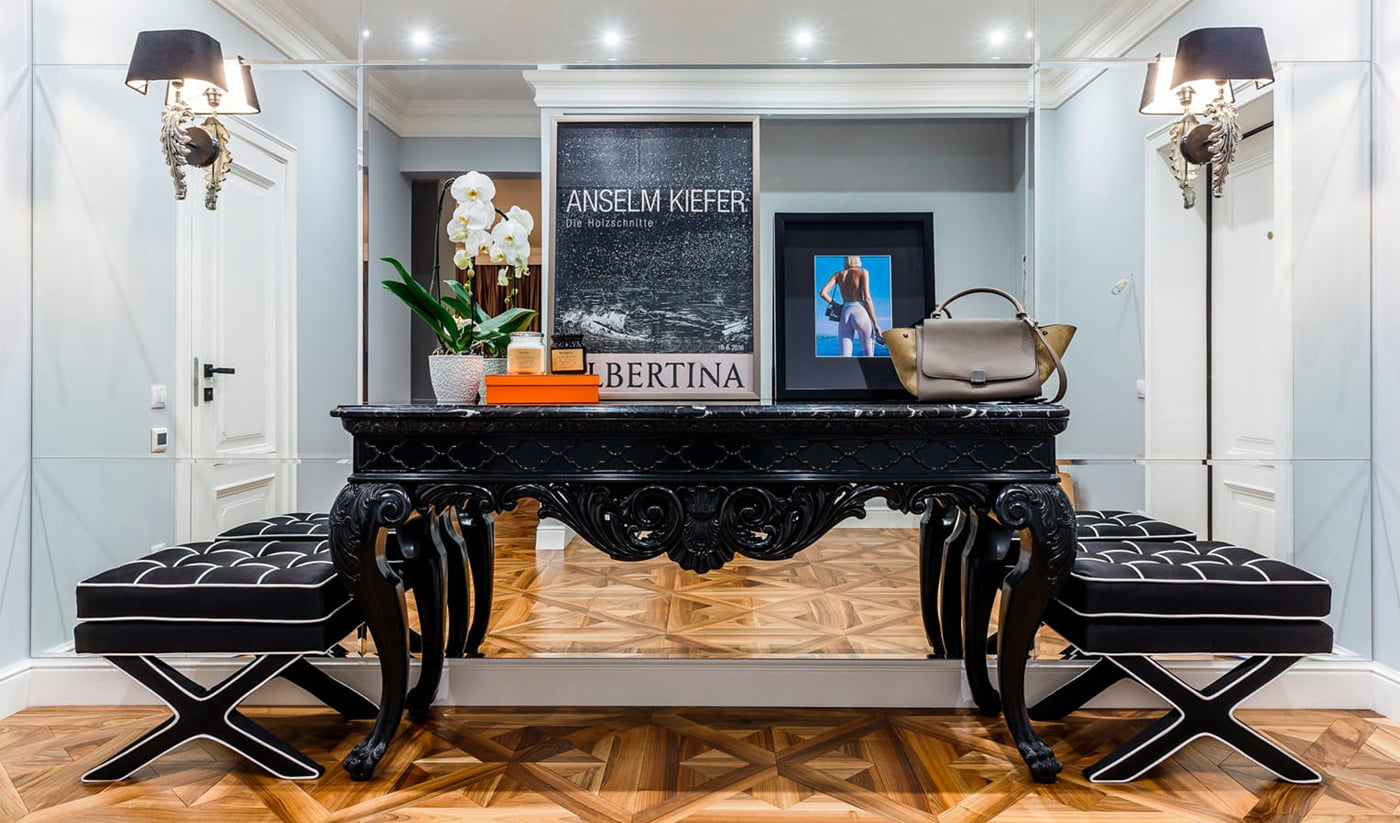 Просторную квартиру с видом на Цемесскую бухту Екатерина Бекух оформила для молодой женщины с дочкой-подростком. Элементы классики - модульный паркет, высокие гипсовые карнизы, мраморный портал камина и современное наполнение и декор – создали актуальный интерьер, который мог бы находиться в любой из европейских столиц. Модульный паркет из американского ореха с геометричным рисунком , который уложили во всех комнатах, стал связующим звеном между всеми зонами квартиры.