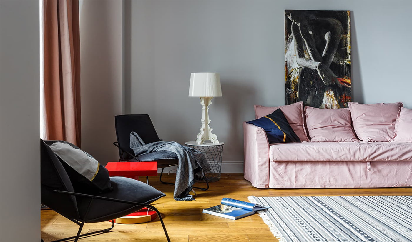 В однокомнатной квартире в центре Краснодара требовалось создать эргономичное, максимально открытое пространство с минимумом мебели и аксессуаров. Для поддержания нужного масштаба были увеличены дверные проемы, а для стен и потолка использован одинаковый светло-серый оттенок — так визуально смягчается переход из одной плоскости в другую, таким образом помещение становится более комфортным.