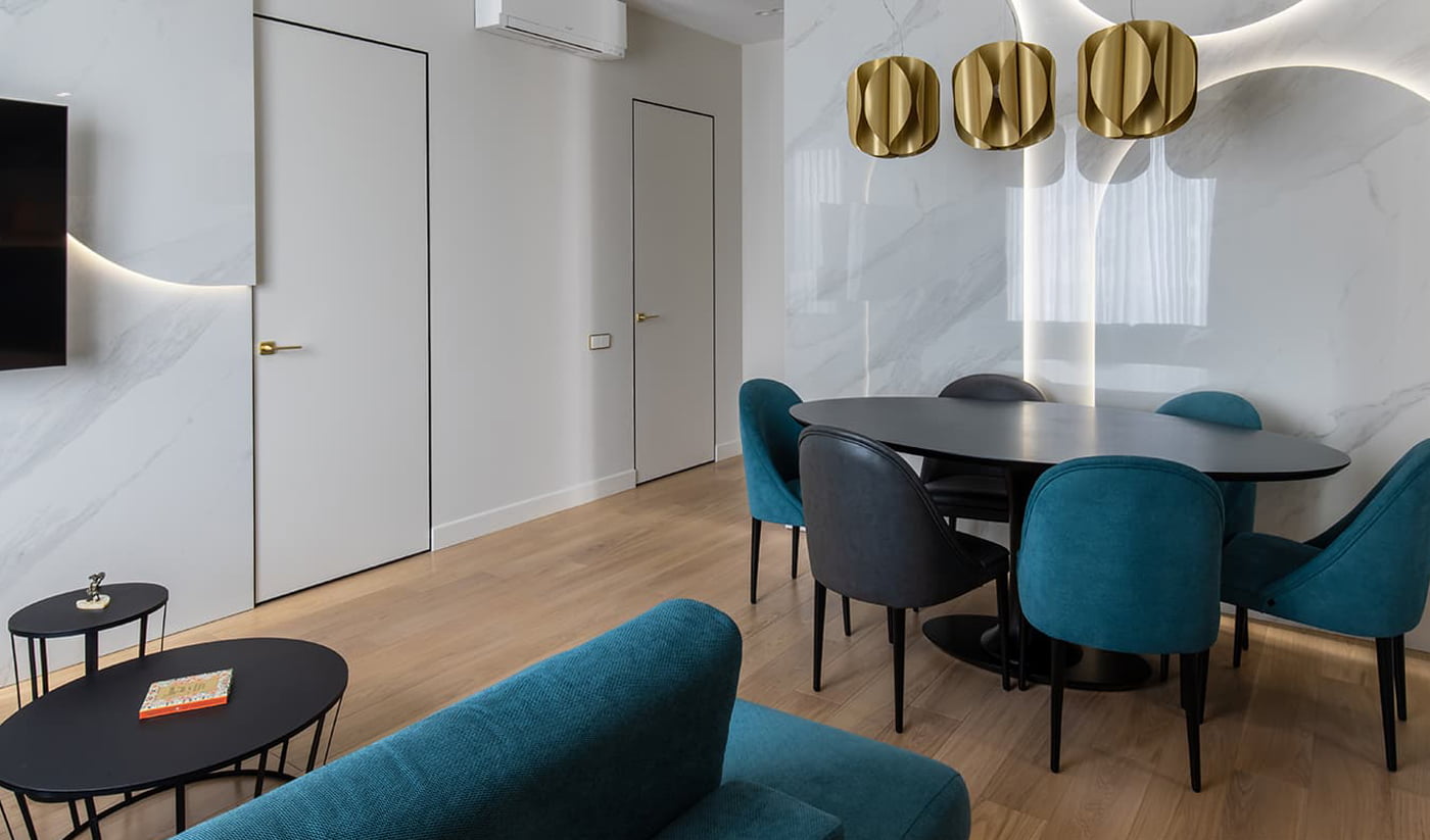 После поездки на испанскую фабрику плитки дизайнер Ирина Бажинова была впечатлена крупноформатным керамогранитом, на 100% имитирующем натуральный камень. «Вернувшись, я поговорила с заказчиками, и мы решили использовать в проекте отделочные материалы, максимально приближенные к природным. Так как акцентом в этом интерьере была настенная крупноформатная плита, то первым, от чего я начала двигаться в подборе материалов, был керамогранит. С этой задачей мы справились очень быстро, а вот подобрать доску, подходящую нам по всем параметрам, было гораздо сложнее. Доска должна была быть светлого натурального ровного цвета, но при этом не напоминать ламинат. Выбрав подходящую по цвету доску, мы достаточно быстро подобрали и остальные материалы. Строителям была поставлена задача в зоне гостиной выложить максимально ровный цвет доски, для этого мы вскрывали большое количество пачек и делали «сортировку», достигая нужного эффекта в гостиной. Это нужно было для того, чтобы акцент в данном помещении падал только на плитку. Но и фон (полы) должны были соответствовать стенам и быть благородного природного цвета».