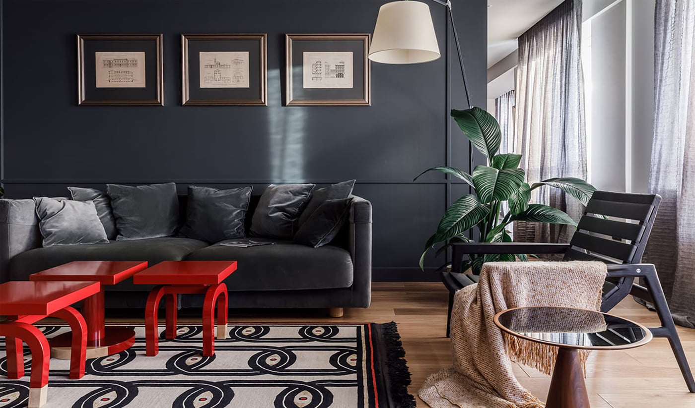 Дизайнер Екатерина Бекух спроектировала жилье для себя и двух своих детей, сына 15 лет и дочери 9 лет. Одно из главных достоинств квартиры – балконы, обращенные на запад, и возможность любоваться закатами по вечерам. Благодаря тому, что отсутствовала несущая стена, Екатерина смогла соединить гостиную и кухню, получилось большое пространство, в котором семья проводит основное время. Оформляя интерьер, дизайнер действовала интуитивно — так что многое, по ее словам, сложилось в нем само собой. Хотела создать не пафосный интерьер, который бы выглядел как современная европейская квартира. И как – то само собой получилось, что в этом проекте абсолютно отсутствует белый цвет, а темные графитовые оттенки противопоставлены светло-серым. Так сложилась комбинация темного керамогранита на полу и светлой инженерной доски, мебели для кухни цвета графит – и светло – серой столешницы. Общие помещения получились достаточно ахроматичными по выбору отделочных материалов. А вот в спальнях уже использованы насыщенные оттенки. Визуально увеличить высоту потолков и дверных проемов помог прием покраски стены и потолков в один цвет.